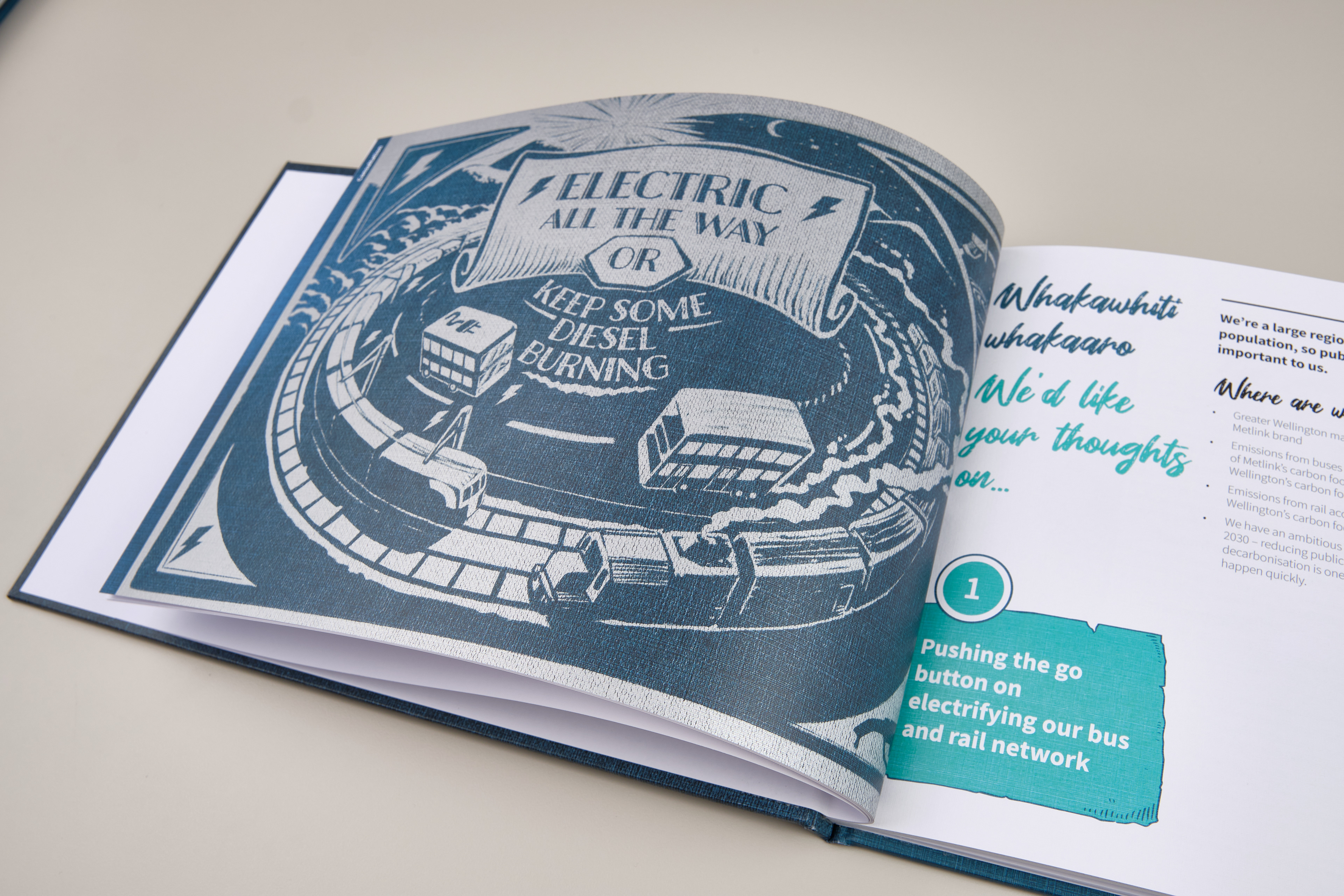 The consultation document was a huge success and one of the more unusual pieces Greater Wellington Regional Council have produced in a long time. We worked very closely with Excel Printers to achieve the look we were after, and they have since used it as an example of their skills.